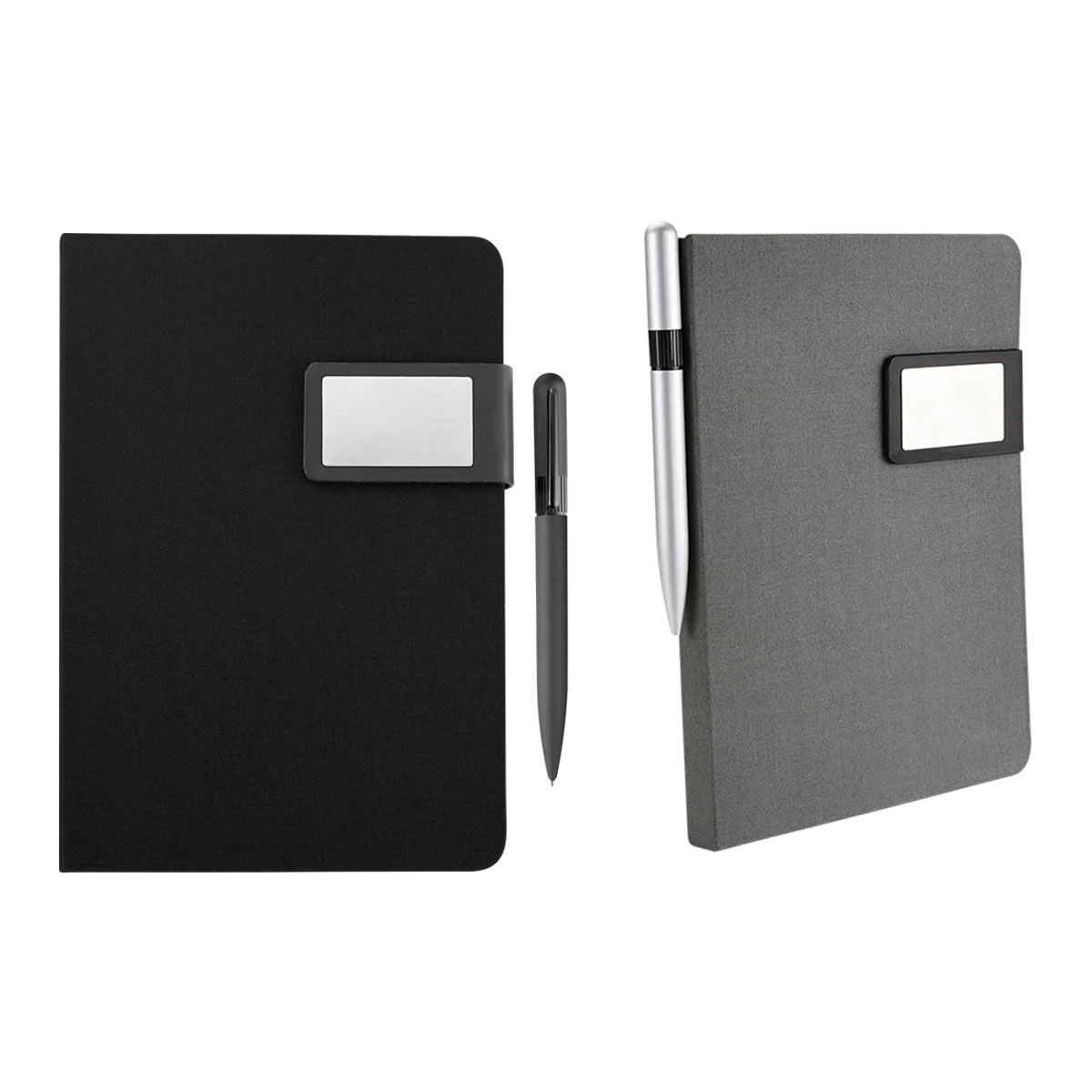 Libreta con 80 hojas de raya. Incluye bolígrafo metálico tinta negra, broche imantado con placa metálica para grabado y caja de regalo.