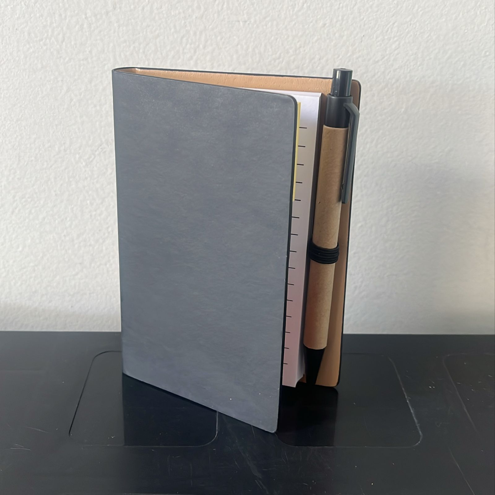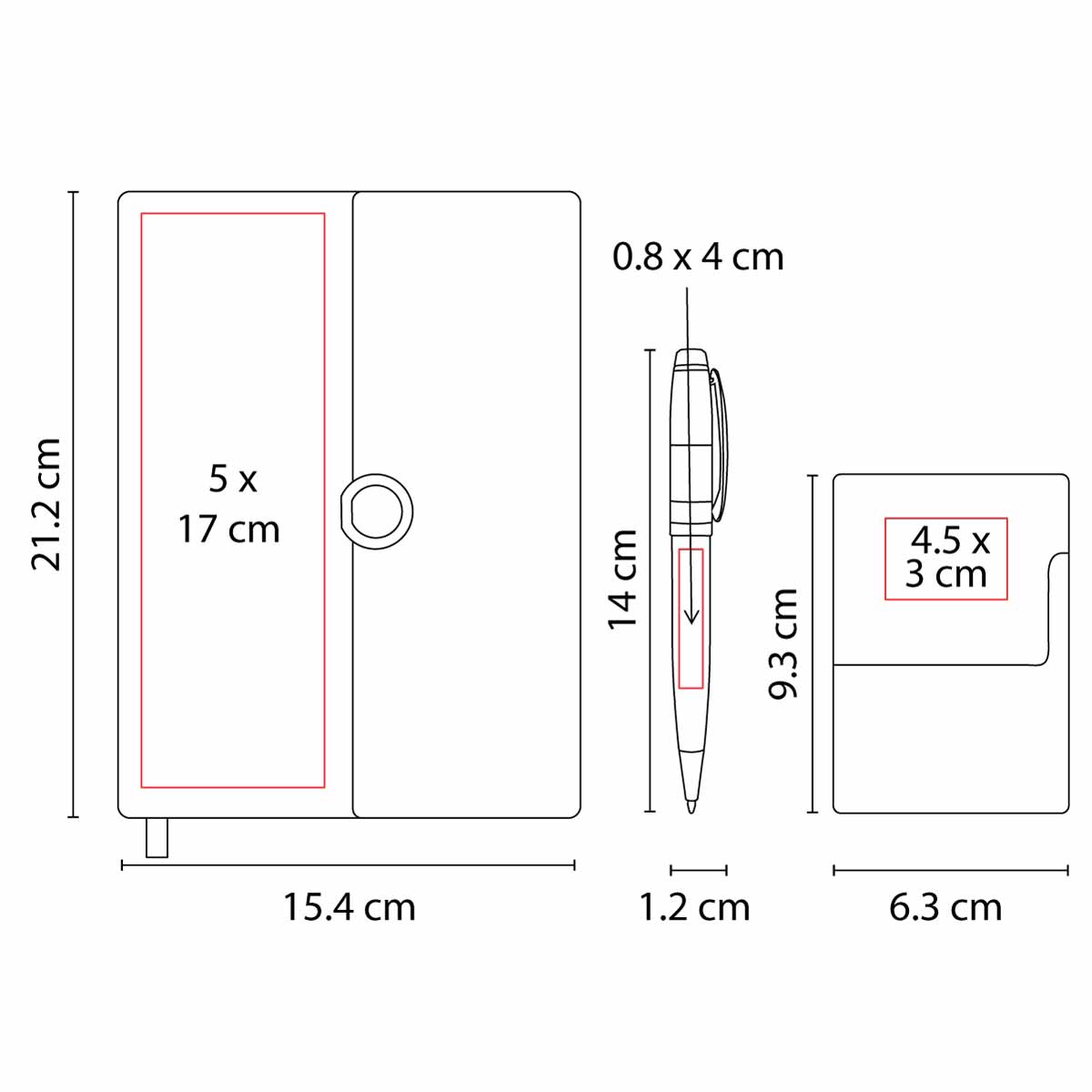 Medida: 15.4 x 21.2 cm Libreta / 1.2 x 14 cm Bolígrafo / 6.3 x 9.3 cm Tarjetero