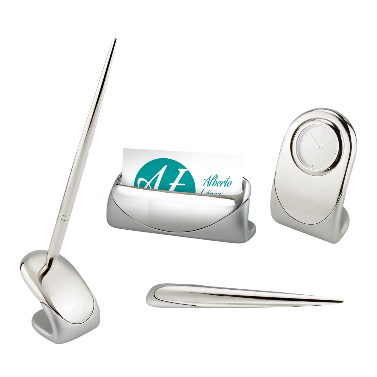 Incluye tarjetero, base con bolígrafo, abrecartas, reloj y caja de regalo.