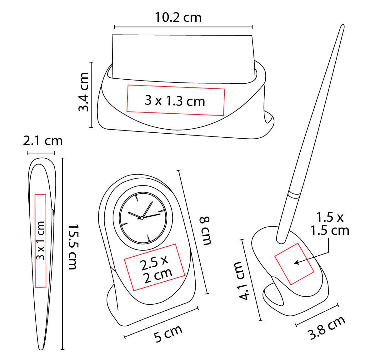 Medida: 10.2 x 3.4 cm Tarjetero / 3.8 x 4.1 cm Base para Bolígrafo / 2.1 x 15.5 cm Abrecartas / 5 x 8 cm Reloj