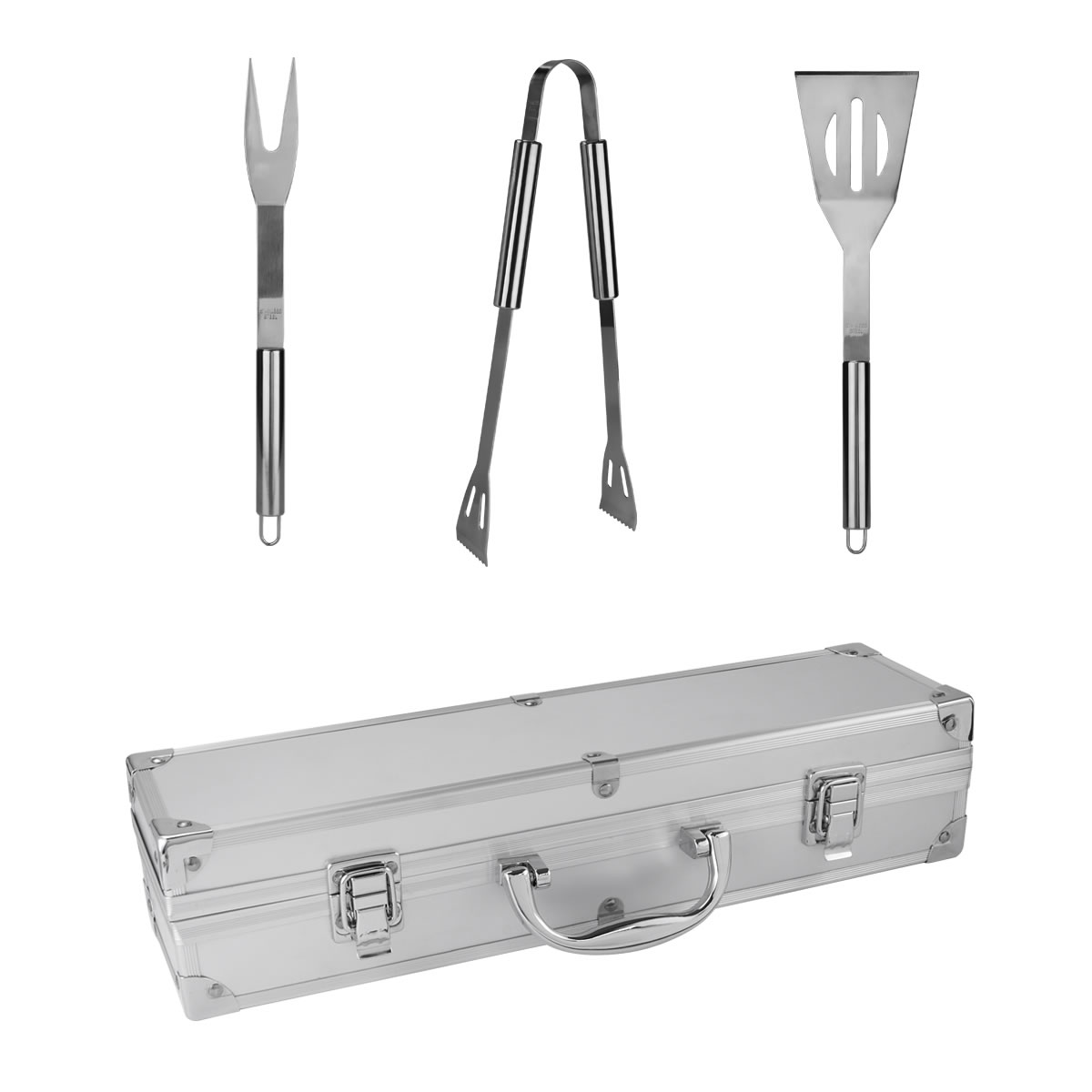 Incluye pinzas, espátula, tenedor y estuche metálico.