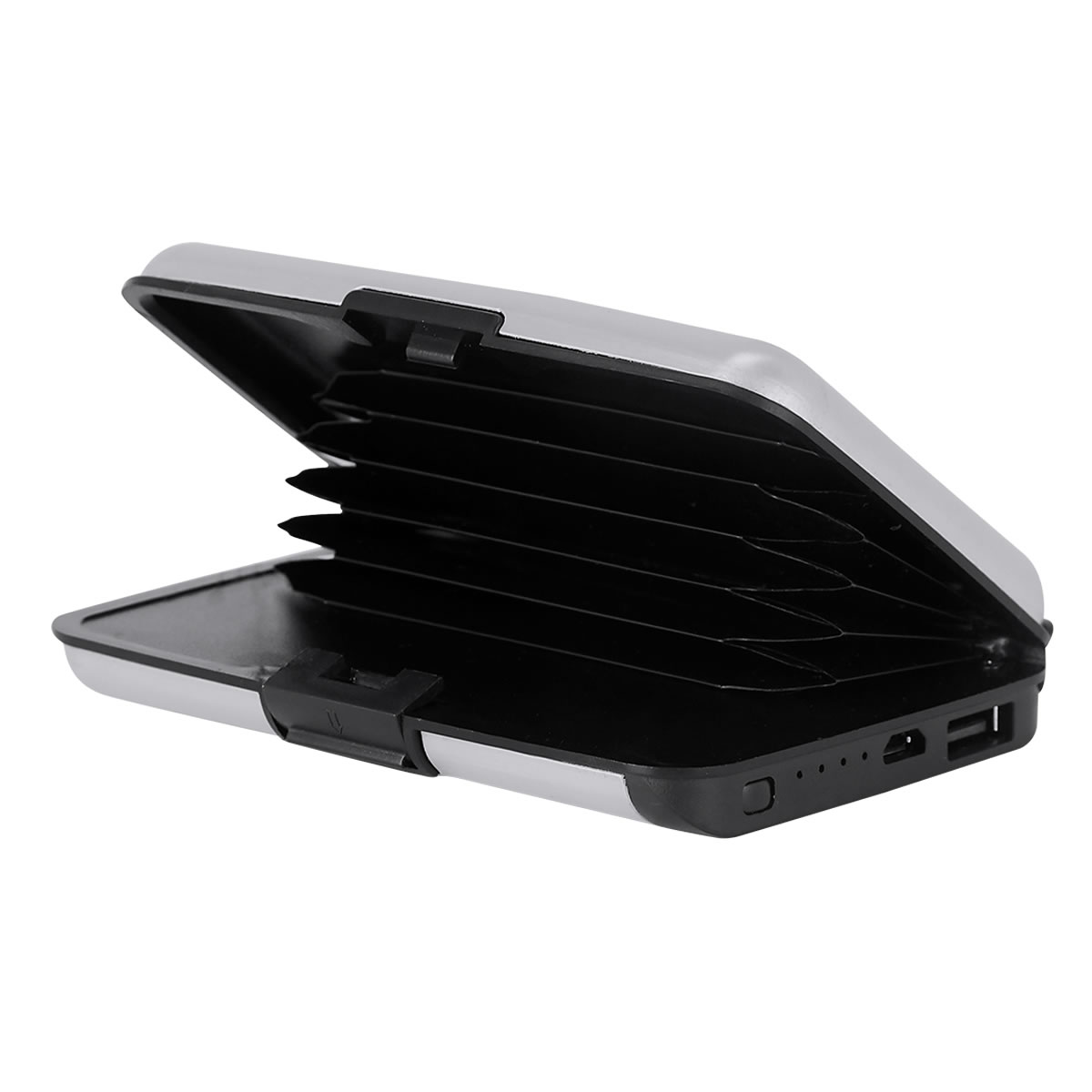 Cuenta con 5 espacios para tarjetas y batería auxiliar capacidad 2,500 mAh. Incluye cable adaptador compatible con micro USB. Sistema anti robo RFID.